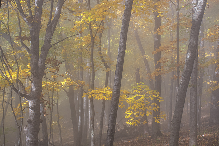 I’ve always loved this time of year. Autumn is such a special time. The changing leaves, the smells and the crisp, cool air have always been energizing to me. So, in a continuing quest to enjoy the seasonal foliage, I set out to do some hiking in the Great River Bluffs State Park along the Mississippi River in southeast Minnesota. As the name suggests, this park features rolling hills and steep bluffs with panoramic views of the river. The drive to the park was clear and sunny. When I arrived, the river and the surrounding hills were partially covered in fog. As I walked the trails I was mesmorized by the fog shrouded forests. Mixed with the autumn colors it gave the surroundings a mysterious and ethereal quality.